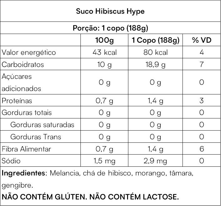 O Suco Hibiscus Hype é uma verdadeira explosão de sabores e nutrientes. A melancia, além de ser hidratante, é rica em licopeno, um antioxidante poderoso que pode ajudar a proteger as células